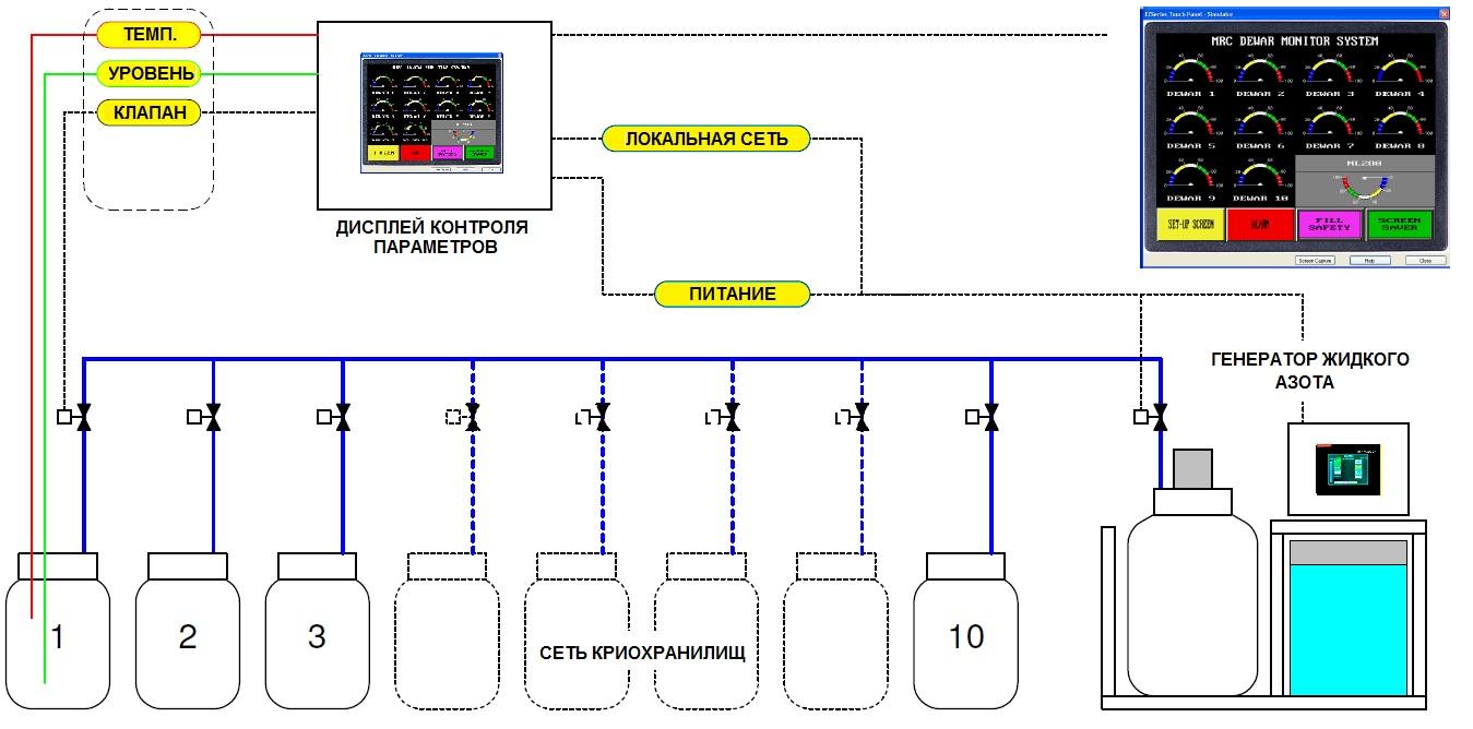 Уровень жидкого азота и температура в криохранилищах и сосудах Дьюара контролируется с помощью одного контроллера. Все результаты отображаются на сенсорном дисплее или экране монитора компьютера. Для каждого сосуда можно настроить критические уровни температуры и уровня жидкого азота при которых система будет переходить в активный режим и осуществлять подачу жидкого азота.