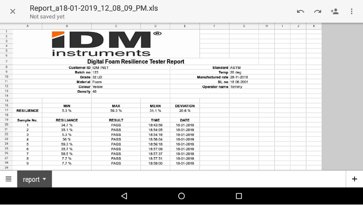 Цифровой тестер упругости пены использует электронный датчик для определения удара стального шарика о образец пены. Используя данные о повторяющихся ударах, программное обеспечение IDM рассчитывает значение отскока. После каждого теста значение отскока отображается на сенсорном экране. Функции и их использование: