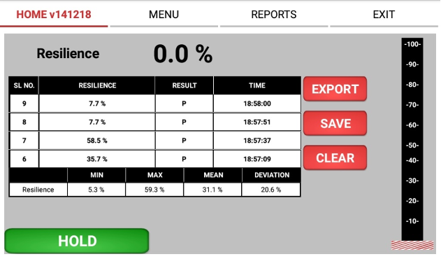 Цифровой тестер упругости пены использует электронный датчик для определения удара стального шарика о образец пены. Используя данные о повторяющихся ударах, программное обеспечение IDM рассчитывает значение отскока. После каждого теста значение отскока отображается на сенсорном экране. Функции и их использование: