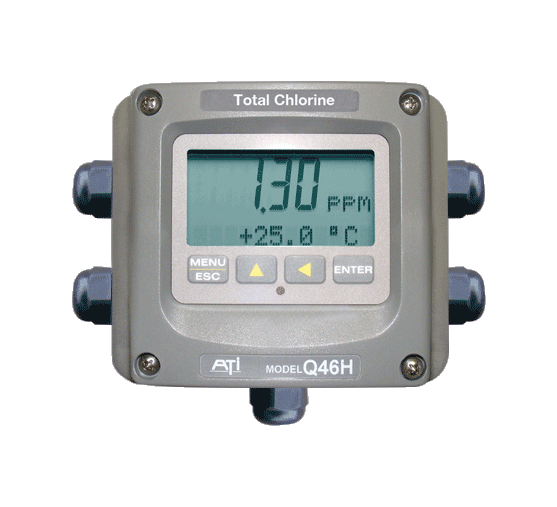 Компания ATI разработала новую модель анализатора общего остаточного хлора, обладающую более высокой чувствительностью и улучшенной стабильностью нуля. Работа анализатора Q46H/79S основана на стандарте EPA, утвержденном в йодометрической химии, где помимо буферного раствора и йодида калия, различные соединения хлора в растворе реагируют с образованием йода. Йод, образующийся в результате таких реакций, измеряется с помощью высокочувствительных амперометрических датчиков (мин.чувствительность 1 PPB). Выходной сигнал этого датчика линейно зависит от концентрации. При этом образец не контактирует с датчиком и не загрязняет его. поверхность. Для работы прибора требуются реагенты.