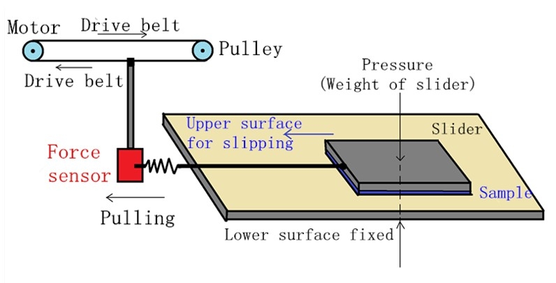 Используйте зажим, чтобы зажать образец тест-полоски, и оберните ползунок тестируемым образцом, а затем поместите ползунок в отверстие для подвешивания датчика. При определенном контактном давлении конвейерная лента приводится в движение двигателем для перемещения датчика силы. , то есть сдвинуть две тестовые поверхности относительно друг друга. Сигнал силы, измеренный датчиком силы, усиливается интегратором и отправляется на регистратор, при этом регистрируются соответственно коэффициент кинетического трения и коэффициент статического трения.