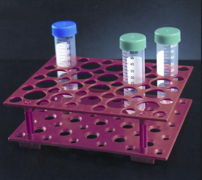 Штатив изготовлен из полипропилена. Выдерживает автоклавирование при 121°С в течение 15 минут. Предназначен для центрифужных пробирок на 50 и 15 мл.