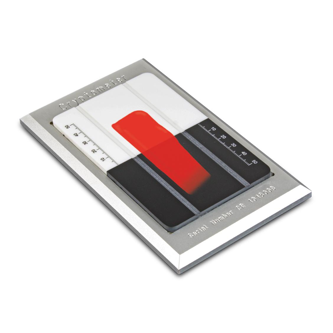 Инструмент состоит из основы – наполовину черной и наполовину белой стеклянной плиты. На одном из краев каждой половины нанесены шкалы 0–50 мм, которые начинаются с разделительной линии в центре. В комплект поставки входят две стеклянные крышки, на одном краю которых расположены две металлические опоры. Таким образом, эти прозрачные крышки при размещении на черной и белой области основы располагаются под углом.
